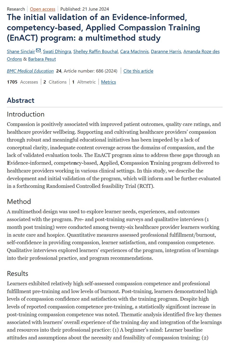 EnACT is a premiere compassion training program that was developed and validated to address these gaps. The evidence and impact of EnACT is clear and convincing—it changes practice, enhances workplace wellbeing, transforms organizations, and importantly, improves compassionate care to patients. The results speak for themselves.